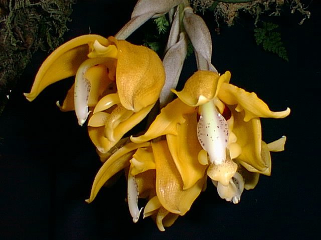 Found in Huanuco department of Peru at elevations around 950 to 1000 meters as a medium sized, warm growing epiphyte with oval, strongly ribbed and furrowed with age pseudobulbs carrying a single, apical, coarse, leathery, lanceoalte, plicate, acute, gradually narrowing below into the petiolate base leaf that blooms in the fall on a basal, pendent, to 6" [to 15 cm] long, loosely 5 to 7 flowered inflorescence with large spreading, broadly triangular, acute floral bracts and carrying fragrant flowers