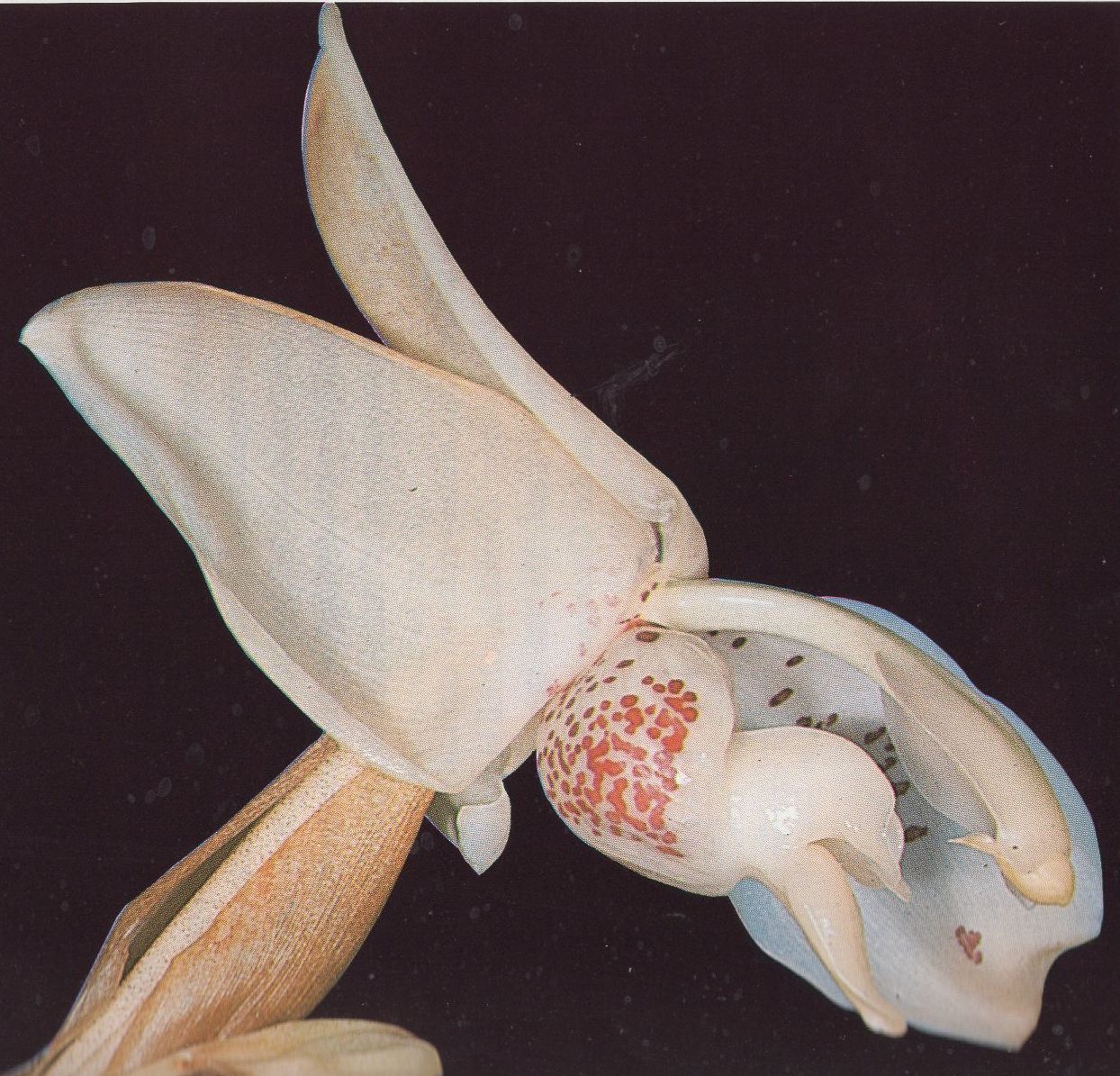 Found in Colombia, Ecuador and Peru in tropical wet and wet montane cloud forests on the western slopes of the Andes at elevations of sealevel to 1200 meters as a small to medium sized, hot to warm growing epiphyte or terrestrial on steep embankments with ovate, ribbed, dark green pseudobulbs carrying a single, apical, plicate, broadly ovate, acute, gradually narrows below into the elongate, petiolate base leaf that blooms in the winter through summer on a short to 6" [15 cm] long, racemose, 2 flowered inflorescence arising on a mature pseudobulb and enveloped by large chartaceous bracts and carrying jasmine scented flowers.