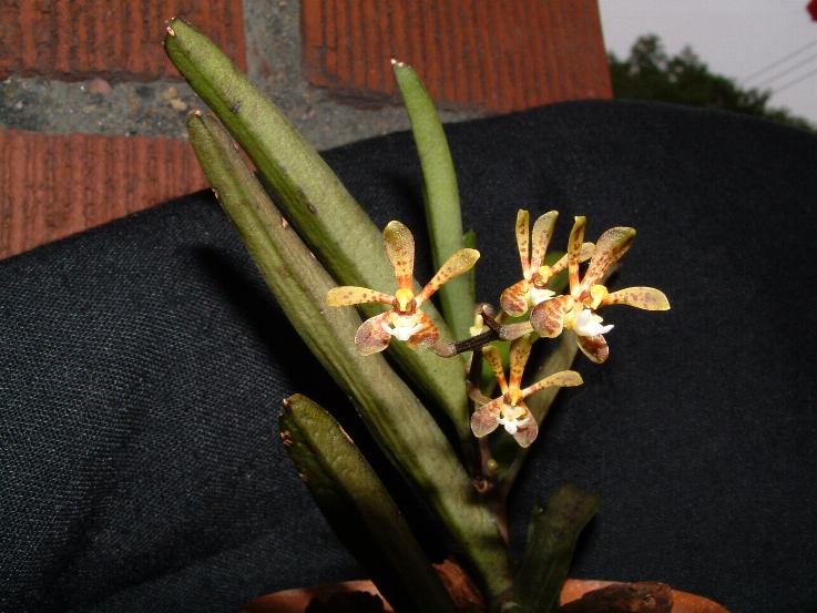 Found in Thailand in seasonally dry forests at elevations of 50 to 400 meters as a medium sized, hot growing monopodial epiphyte with an erect stem carrying 2 ranked, strap-shaped leaves that blooms in the spring on an axillary, 3 branched, 12 to 20" [30 to 50 cm] long, successively few, to 30 flowered inflorescence flowered inflorescence.