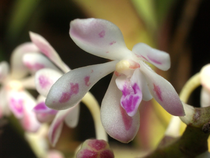 Found in Thailand and Vietnam in primary broad-leaved evergreen montane forests at elevations around 1500 meters as a medium sized, cool growing epiphyte with strong, upward curving stems carrying 2 ranked, strap shaped, unequally bilobed leaves that blooms in the late winter and earlier spring on an axillary, everal flowered inflorescence
