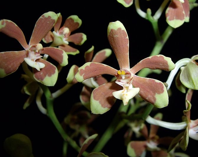 Found in the Philippines, Taiwan and the Ryukyu Archipelago south of Japan in broad leaved forests at elevations of 300 to 1300 meters as a giant sized, warm to cool growing epiphyte with an erect stem carrying many very leathery, gracefully arching, unequally bilobed apically leaves that blooms in the spring on an axillary, erect, branching, many [25] flowered inflorescence carrying sweetly fragrant flowers