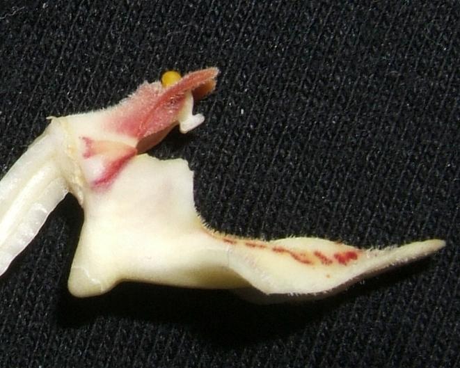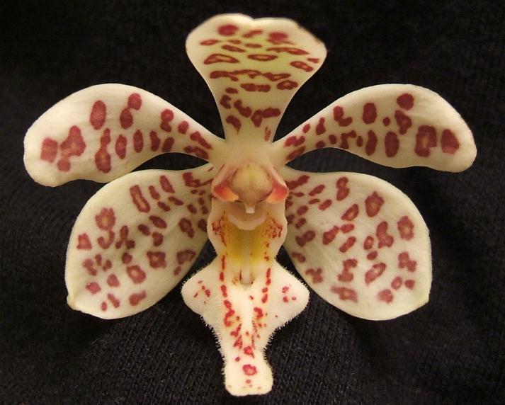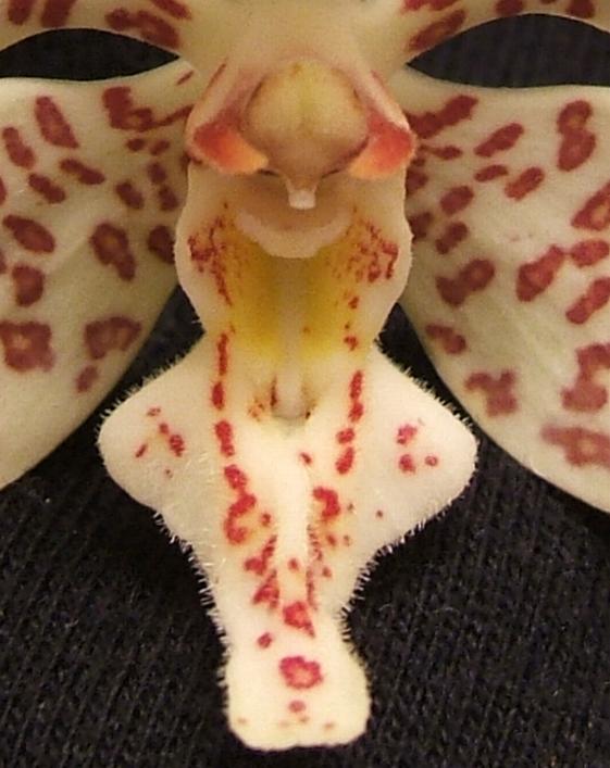 Found in the Philippines at elevations of sea level to 500 meters as a medium to large sized, monopodial, hot to warm growing epiphyte or lithophyte on limestone with subterete stems enveloped by leaf sheaths and carrying 2 ranked, oblong-strap-shaped, leathery, dark green, unequally bilobed apically with obtuse lobed leaves that blooms in the later spring and summer a long, axillary, erecct to pendant, racemose, loosely several to many flowered, paniculate inflorescence with successive opening flowers.
