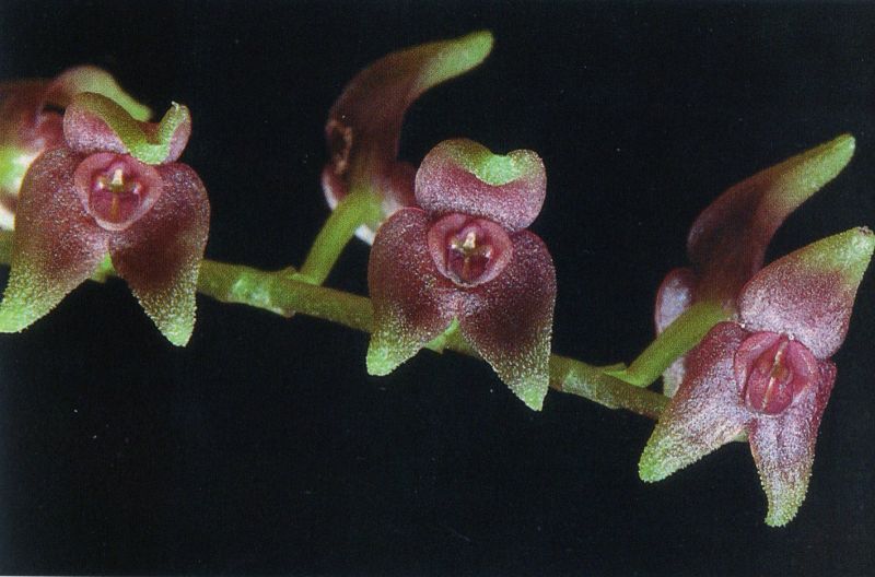 Found in Zamora-Chinchipe Ecuador at elevations around 800 to 1200 meters as a small sized, warm to cool growing epiphyte with stout, erect ramicauls with a tubular sheath below the middle and 2 to 3 others at the base and carrying a single, erect, coriaceous, elliptical, sessile, subacute, gradually narrowing below into the base leaf that blooms in the summer on an apical, erect, sublax, secund, 9.1" [23 cm] long including the 3.2” [8 cm] long peduncle, many flowered inflorescence arising through a spathe and has short, obtuse floral bracts.
