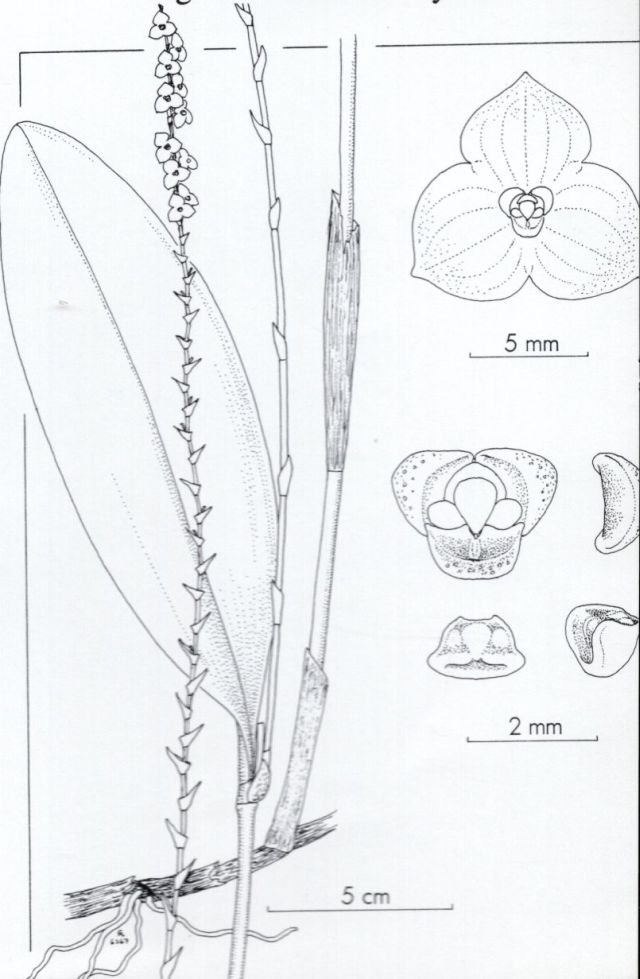 Found in Colombia and Ecuador at elevations of 2400 to 3150 meters as a medium sized, cold growing, repent epiphyte with stout, erect ramicauls with a loose tubular sheath near the middle and 2 others at the base and carrying a single, erect, coriaceous, elliptical, obtuse, narrowly cuneate below into the petiolate base leaf that blooms in the late summer and earlier fall on an erect, peduncle 2 to 8" [5 to 20 cm] long, arising through a spathe .4 to .6" [1 to 1.5 cm] long, from an annulus below the the apex of the ramicaul, rachis 12 to 14" [30 to 35 cm] long, congested, distichous, simultaneously several, progressively many flowered inflorecence with oblique, acute, longer than the pedicel floral bract and carrying flowers with glabrous red-purple externally, dull greyish white to silver white, cellular glandular internally sepals, thick, yellow petals and a thick, yellow lip.