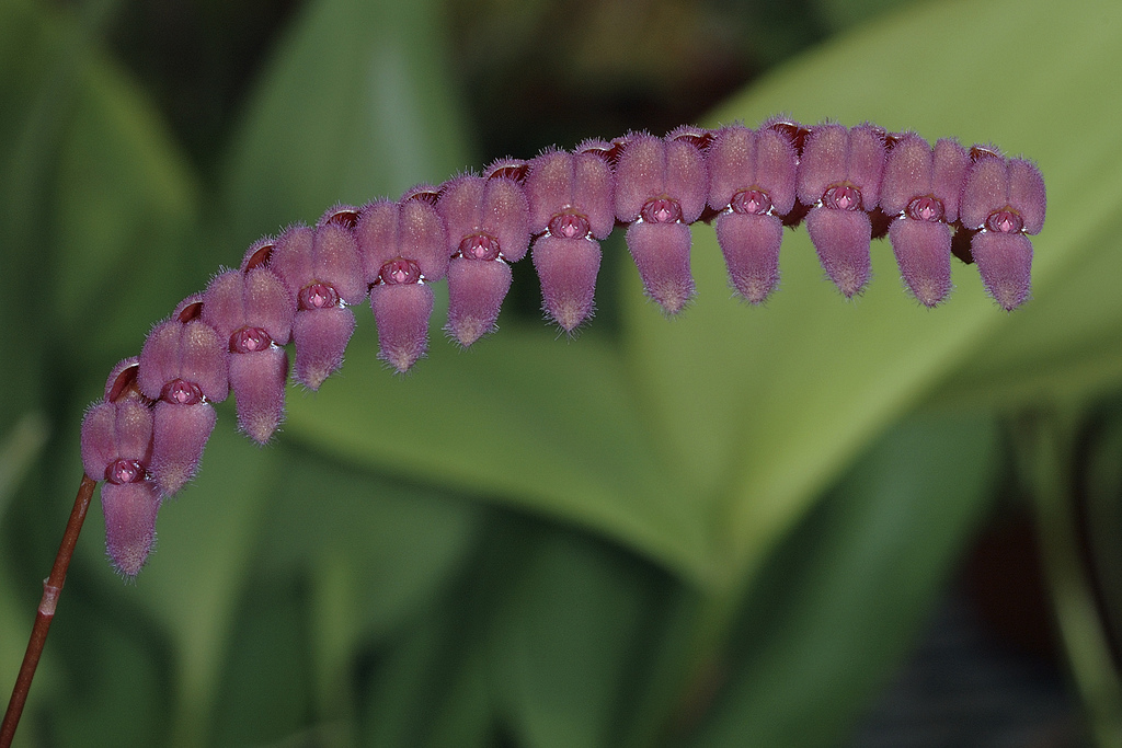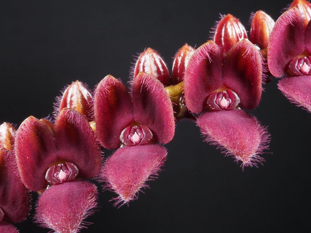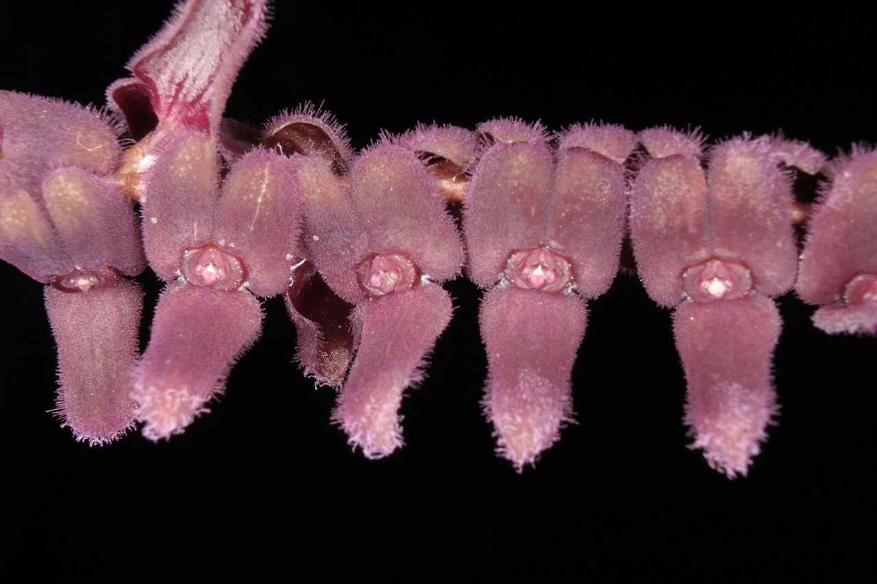 Found in Ecuador at elevations around 1650 meters as a miniature sized, cool growing epiphyte with ascending-erect, stout, fascicled ramicauls enveloped basally by 2 loose, tubular sheaths and carrying a single, apical, purple, erect, thickly coriaceous, elliptical, subacute to obtuse, cuneate below into the petiolate base leaf that blooms in the spring on a congested, two ranked, distichous, 8" [20 cm] long including the 6" [15 cm] long peduncle, simultaneously many flowered inflorecence arising from the base of the leaf with tubular floral bracts.