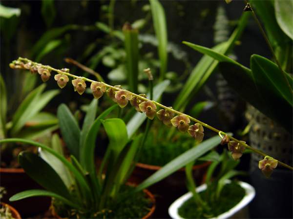 Found from Costa Rica to Ecuador at elevations around 500 to 1600 meters meters as a small sized, hot to cool growing epiphyte with erect, elongate ramicauls enveloped basally by several, close, tubular, acuminate sheaths and carrying a single, apical, erect, coriaceous, elliptic, round and retuse apically, gradually narrows below into a short, conduplicate, petiolate base leaf that blooms in the late spring and early summer on an erect, 8" [20 cm] long, many flowered, racemose inflorescence that is longer than the leaf and has small floral bracts.