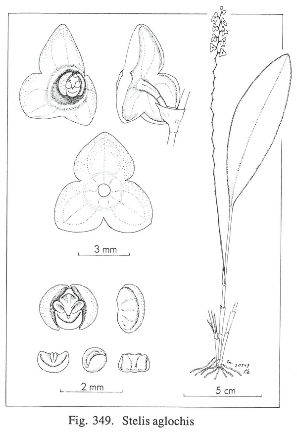 Stelis aglochis Luer 2009 SECTION Stelis Drawing by Carl Luer and The Swiss Orchid Foundation at the Jany Renz Herbaria Website