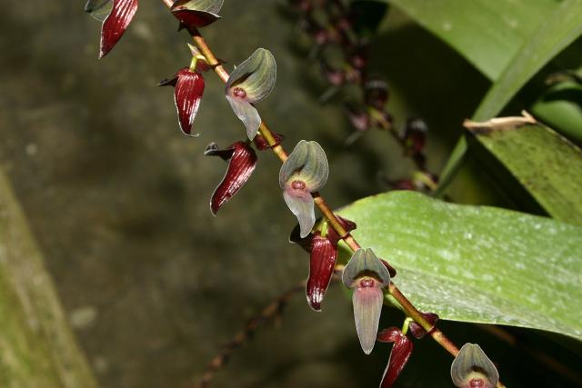 Found in Panama, Ecuador and Bolivia at elevations of 300 to 950 meters as a small to medium sized, hot to cool growing epiphyte with an erect stem enveloped completely by 2 to 3, loose, evanescent sheaths and carrying a single, leathery, elliptic to elliptic-oval, acute or obtuse leaf that has a basal short petiole that blooms at any time of the year but mostly in the spring, on 1 to several, 12" [30 cm] long, many flowered inflorescence that has flowers down to the base and has large cucullate sheaths and infundibuliform bracts with the largest, nodding flowers of the genus.