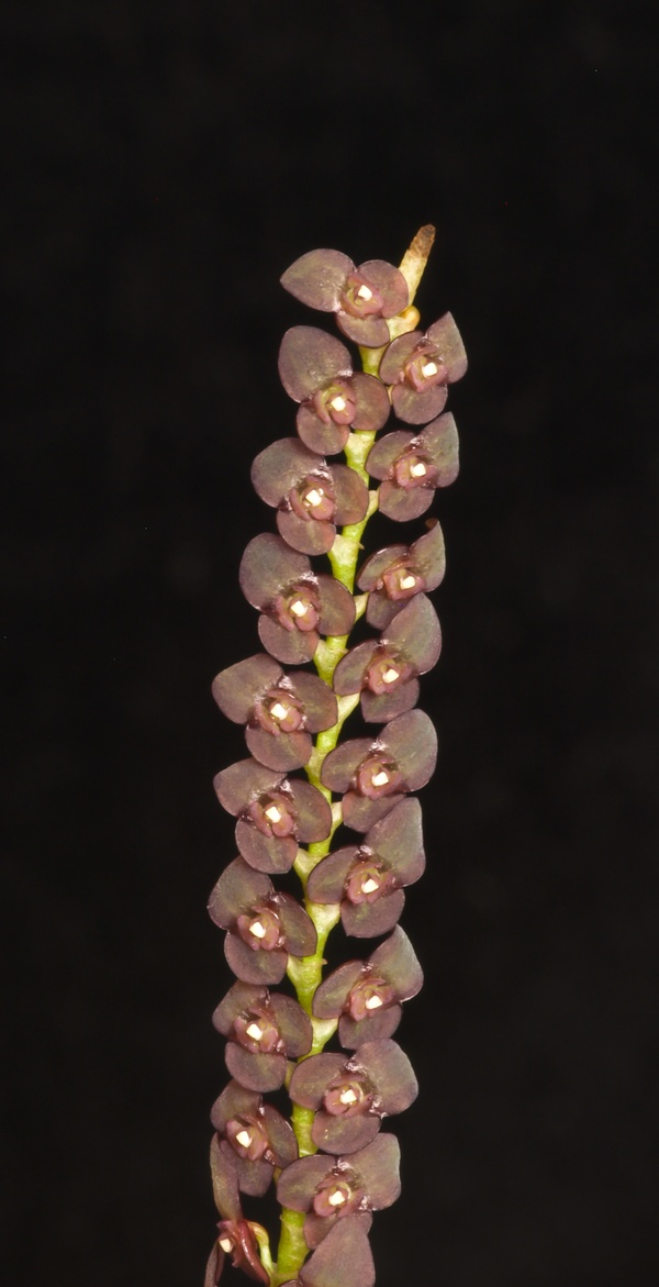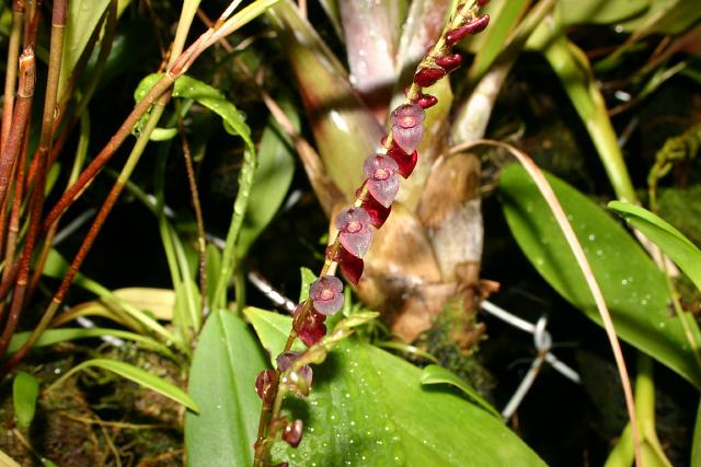 Found in Morona-Santiago Ecuador at elevations around 1300 meters as a miniature sized, warm growing, caespitose epiphyte with erect ramicauls enveloped by a tubular sheath and 2 others at the abse and carrying a single, apical, erect, coriaceous, narrowly linear-elliptic, acute, narrowly cuneate below into the base leaf that blooms in the summer on an erect, congested, distichous, mostly simultaneous, several to many flowered, 4.4 to 4.8" [11 to 12 cm] long, closely spaced inflorescence arising through a slender spathe at the base of the leaf with oblique, obtuse floral bracts with alternating flowers all facing in the same direction