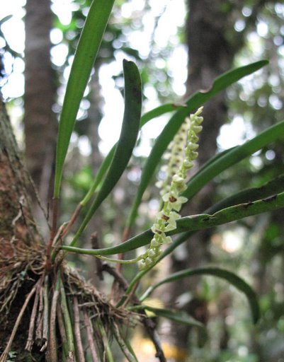 Found in Venezuela, Colombia and Ecuador in cloud forests at elevations around 1500 to 2500 meters as a small sized, cool to cold growing epiphyte with erect ramicauls partly enveloped by 2 to 3, fibrous sheaths and carrying a single, apical, erect, narrowly elliptic, semi-terete, thick, subacute and tridenticulate apically, gradually narrowing below in to the petiolate base leaf that blooms on 1 to 2, erect, 4 to 5.6" [10 to 14 cm] long, racemose, distichous to subsecund, many flowered inflorescence arising through a spathe and has large, cucullate-infundibular scute, imbricate at inception becoming distant floral bracts.