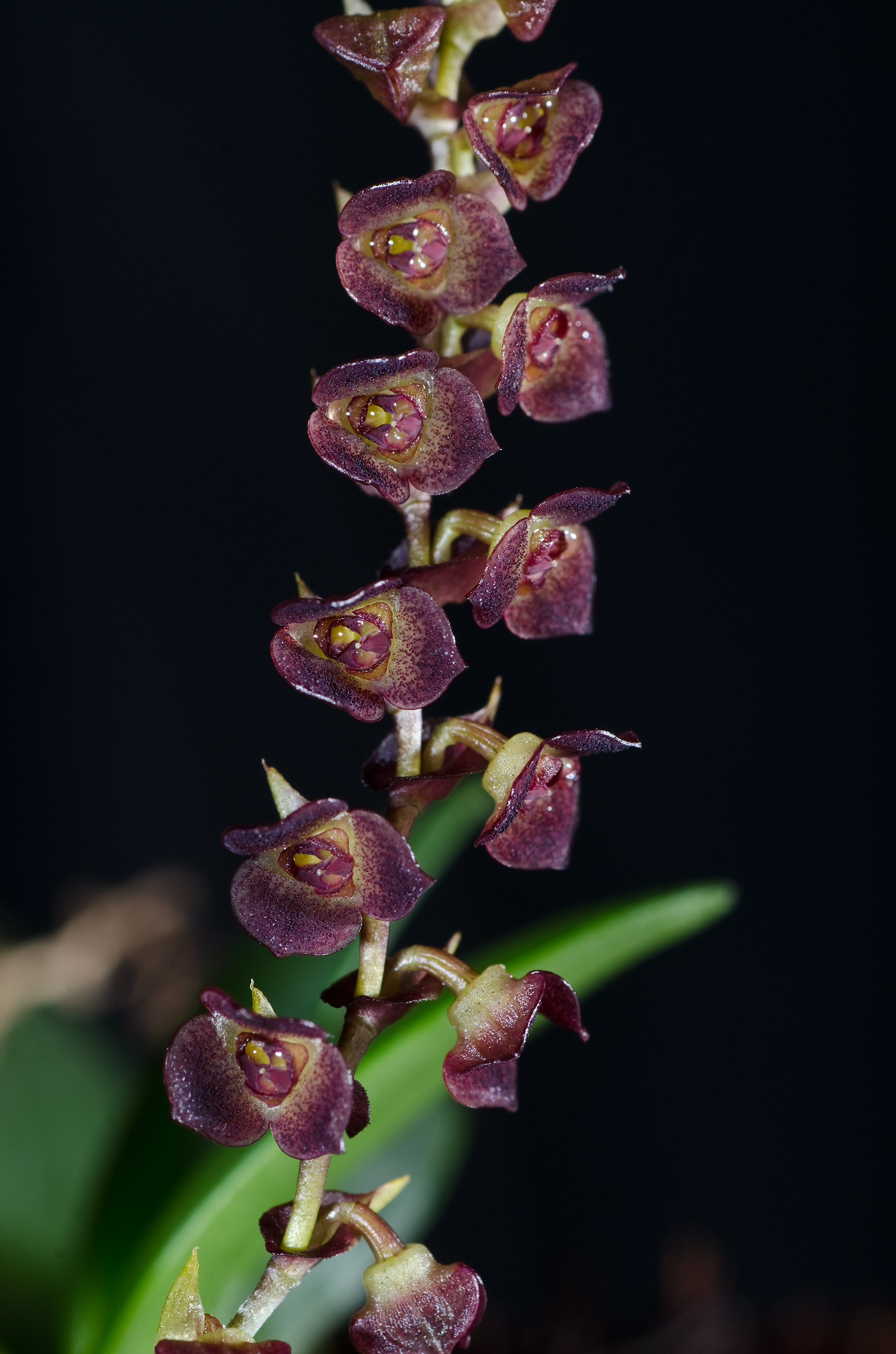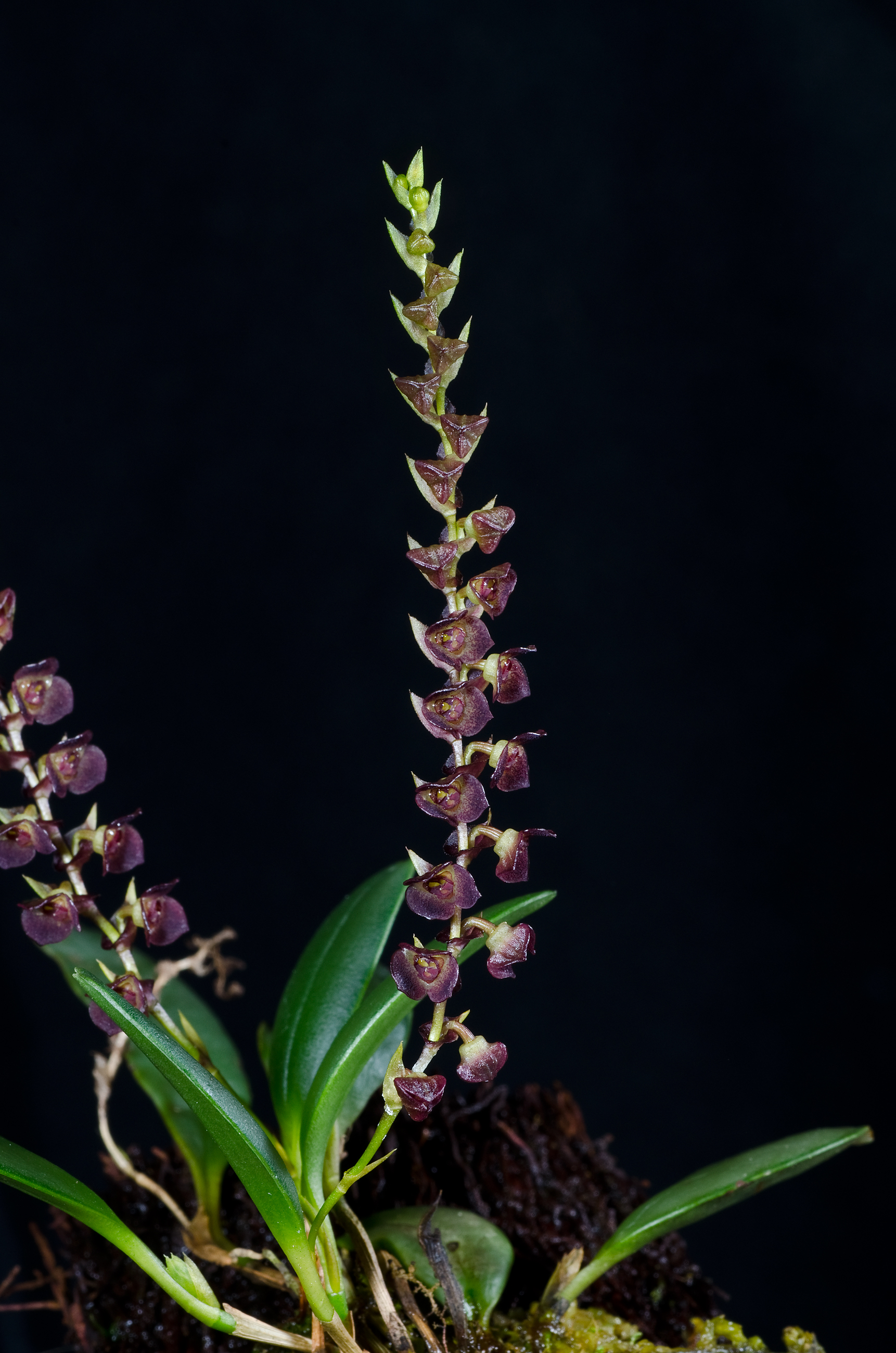 Found in Nicaragua, Costa Rica, and Panama at elevations around 1050 meters as a mini-miniature sized, warm growing epiphyte with erect, slender ramicauls enveloped by 2 to 3 sheaths and carrying a single, apical, erect, coriaceous, oblong-ligulate, obtuse, narrowly cuneate below into the petiolate base leaf that blooms in the fall on a distichous, erect, subdense short to .6” [1.5 cm] long with a very short peduncle, many flowered inflorescence with ovate, acuminate floral bracts