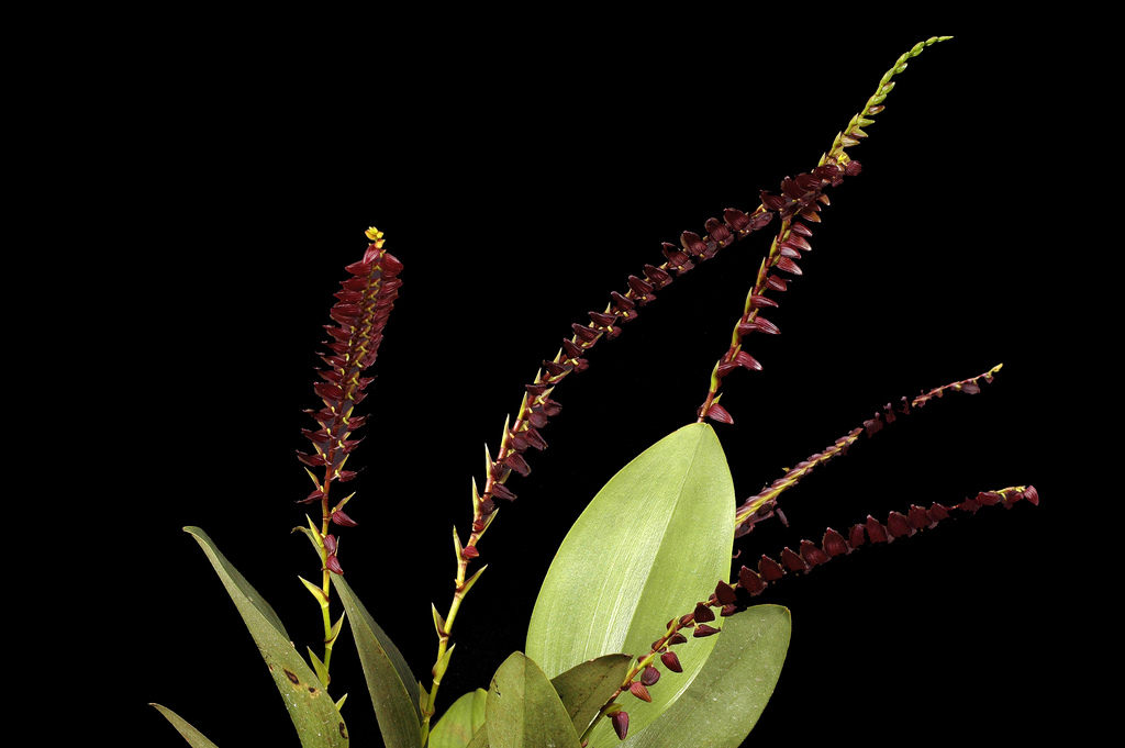Found in Antioquia Colombia in montane forests at elevations of 1800 to 3000 meters as a medium sized, cool to cold growing epiphyte with erect, stout ramicauls enveloped by 3 short, basal sheaths and carrying a single, apical, erect, coriaceous, broadly elliptic-oblong, striated, obtuse, tridenticulate, narrowing below into the canaliculate petiolate base leaf that blooms on 1 to 3, distichous, to 12" [30 cm] long, including the 2 to 2.8" [5 to 7 cm] long peduncle, mostly simultaneously many flowered inflorescence arising through a speathe and has large, navicular, acute floral bracts.