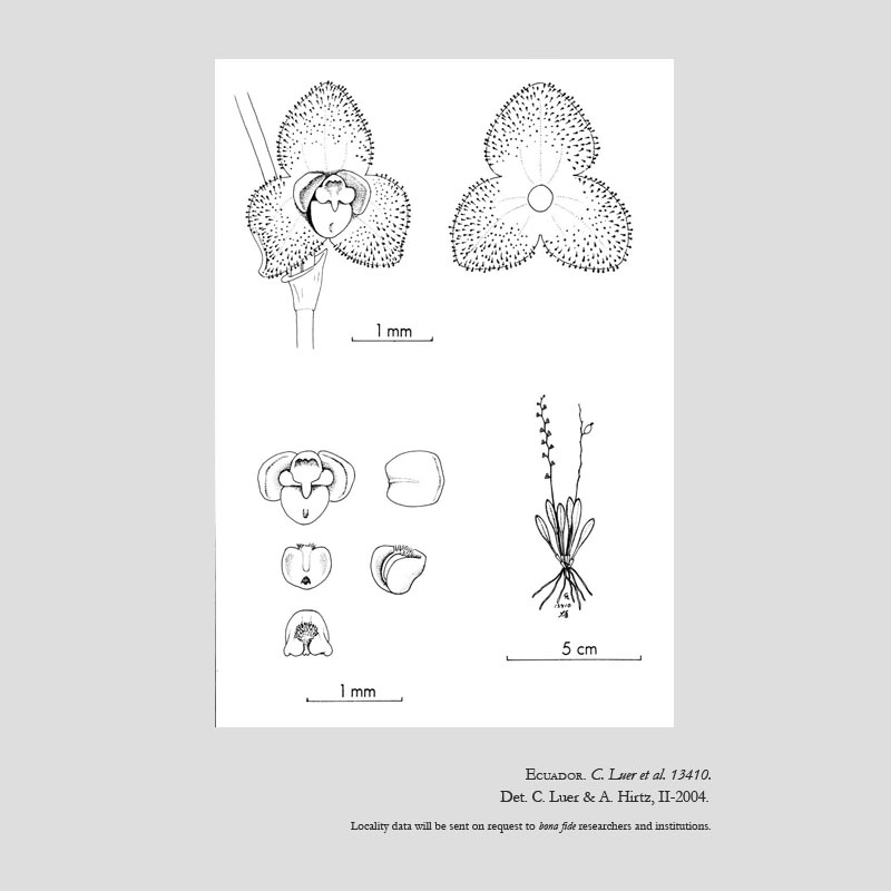 References W3 Tropicos, Kew Monocot list , IPNI ; *Icones Pleurothallidinarum Vol XXVI Luer 2004 drawing fide; Harvard Papers in Botany, Vol. 17, No. 2, pp. 333 to 368 2012 MISCELLANEOUS NEW SPECIES IN THE PLEUROTHALLIDINAE (ORCHIDACEAE) Carlyle A. Luer