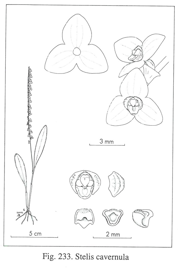 Stelis cavernula Luer & Dalström 2007 SECTION Stelis Drawing by © Carl Luer and The Swiss Orchid Foundation at the Jany Renz Herbaria Website