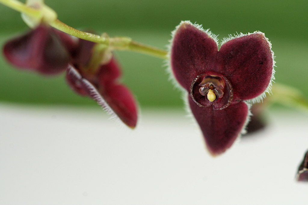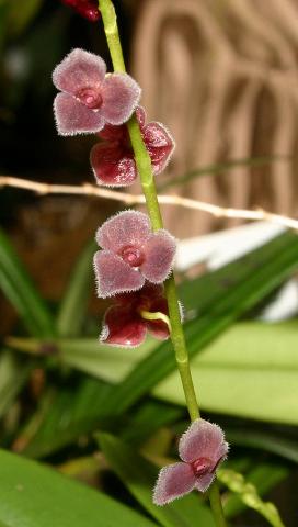 Found in Ecuador at elevations around 1500 to 2400 meters as a mini-miniature sized, cool to cold growing epiphyte with erect, stout ramicauls enveloped by 2 tubular sheaths and carrying a singler apical, erect, coriaceous, elliptical, subacute, cuneate below into the petiolate base leaf that blooms in the fall on 1 to 3, erect to suberect, 2 to 4.4" [5 to 11 cm] long, subdense, distichous, several flowered inflorescence arising through an annulus below the apex of the ramicaul, with oblique, dilated floral bracts and carrying mostly simultaneously opening flowers.
