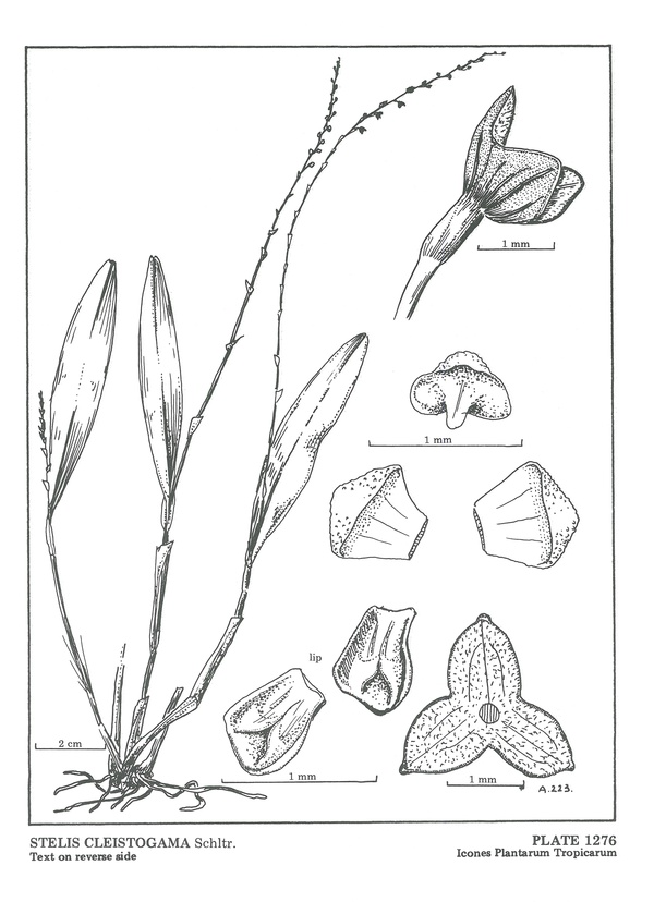 References W3 Tropicos, Kew Monocot list , IPNI ; Orchids of Guatemala Ames Correll 1952 drawing ok; Las Orquideas de El Salvador Vol 2 Hamer 1974 drawing/photo fide; Icones Plantarum Tropicarum Plate 1276 Fritz Hamer 1985 drawing fide; ORQUIDEA (MEX.) 13(1- 2) Solano and Soto Arenas DICIEMBRE 1993 drawing fide; Orchidaceae Stelis Swartz A Compendium Duque 2008 drawing ok; Orchid Genera and Species in Guatemala Archila, Szlachchetko, Chiron, Lipinska, Mystkowska and Bertolini 2018