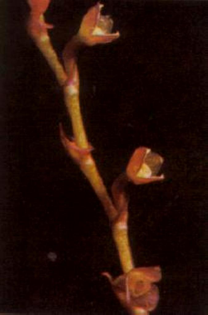 Found in Mexico, Guatemala, El Salvador, and Honduras at elevations around 1500 meters as a small sized, cool growing epiphyte with an erect, stout ramicaul enveloped by 2 sheaths and carrying a single, apical, erect, coriaceous, oblanceolate-ligulate, obtuse, cuneate below into the short petiolate base leaf that blooms in the spring on a erect, laxly, distichous, 8” [20 cm] long including the .8” [2 cm] long peduncle, mostly simultaneously many flowered inflorescence arising through a spathe from below the apex of the ramicaul with cuculate, apiculate floral bracts.