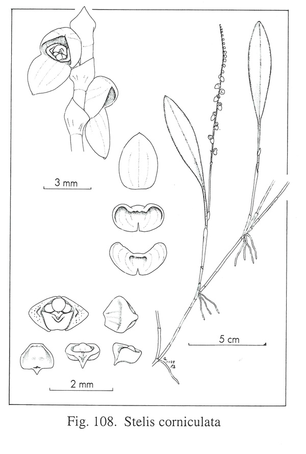 Stelis corniculata Luer & Hirtz 2004 SECTION Humboldtia Drawing by © Carl Luer and The Swiss Orchid Foundation at the Jany Renz Herbaria Website