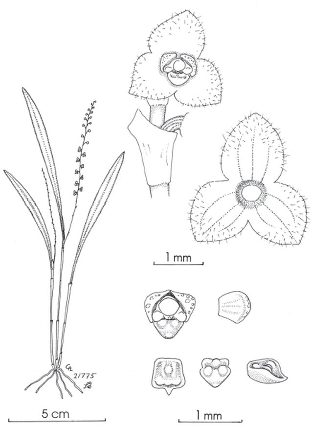 "This medium-sized, slender, densely caespitose species of SECTION Stelis is distinguished by nearly linear leaves, and a single, subdensely f;lowered raceme that approaches the length of the leaf. The flowers are minute with obtuse sepals that are sparsely and finely long-pubescent within, in spite of the minute size, the petals are three-veined; and the type A lip is acute at the apex, with the sides of the bar swollen on either side of a lesser central swelling, and a small, rounded callus on the dorsum." Luer 2013