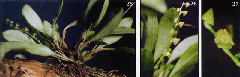 Found in Valle de Cauca department of Colombia at elevations around 1500 meters as a mini-miniature sized, cool growing, caespitose epiphyte with very short ramicauls enveloped basally by 2 short, tubular sheaths and a larger one above that covers the rest of the ramicaul and carrying a single, apical, erect, elliptic-obovate, obtuse, tridenticulate, narrowing below into the petiolate base leaf that blooms on a racemose, peduncle enveloped by a cauline bract, .32 to .52" [.8 to 1.3 cm] long, few flowered inflorescence with distichous, cucullate-acute, floral bracts.