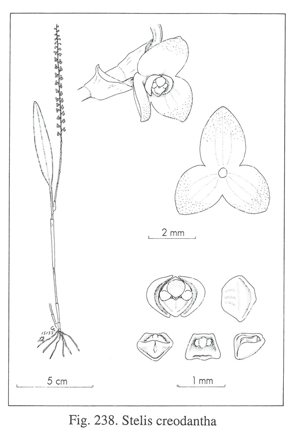 Stelis creodantha Luer & Hirtz 2007 SECTION Stelis Drawing by © Carl Luer and The Swiss Orchid Foundation at the Jany Renz Herbaria Website