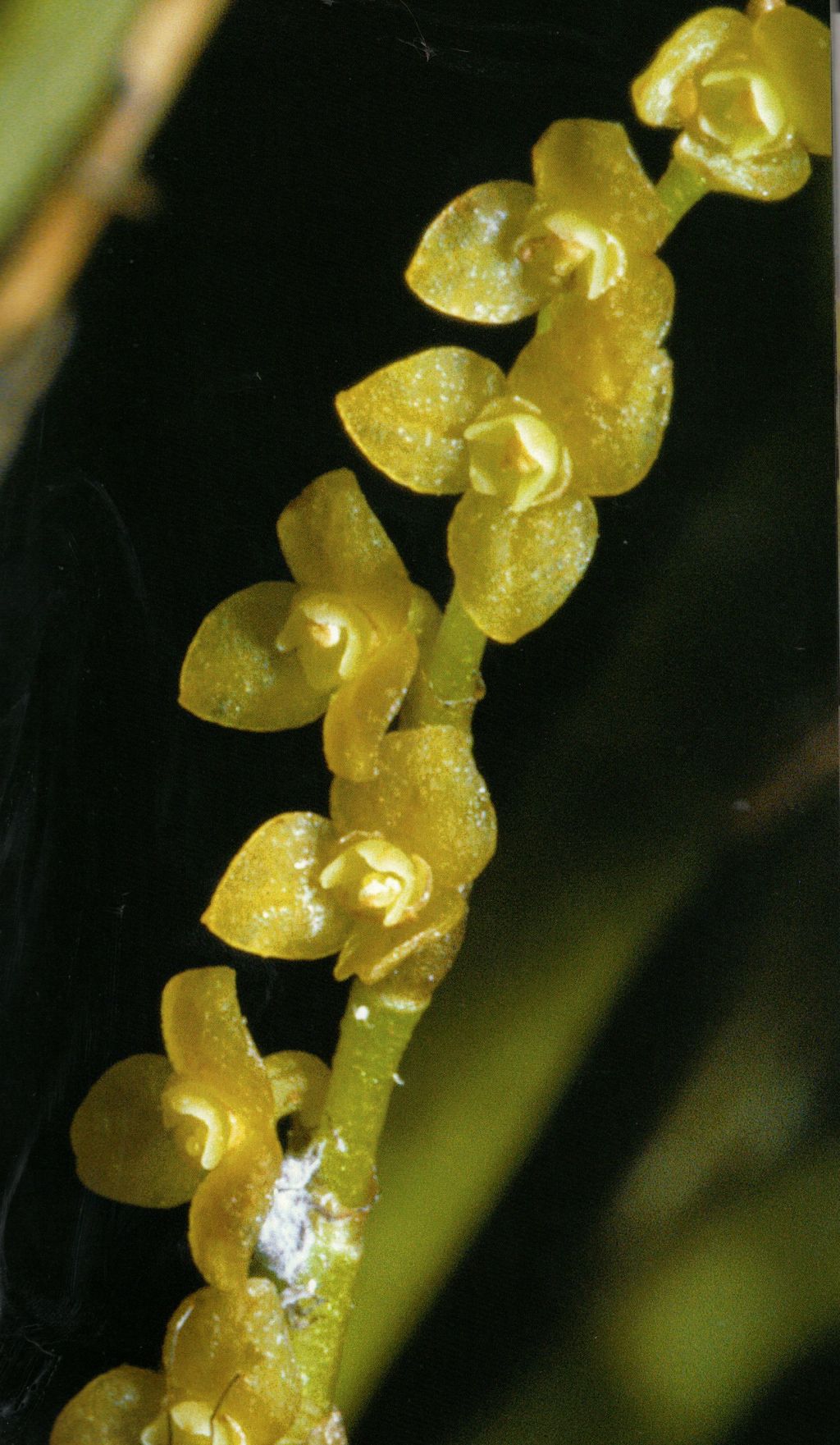 Found in southeastern Cuba miniature to just small sized, caespitose, cool growing epiphyte with approximate, erect, slender, terete ramicauls enveloped by 3, brownish, scarious sheaths and carrying a single, apical, fleshy, oblanceolate-ligulate, obtuse, narrowing below intothe petiolate base leaf that blooms in the winter spring and summer on 2 to 3, slender, arising through a very short spathe, almost to as long as the leaf, to 2.4" [ 6 cm] long, densely many flowered inflorescence with ovate-cucllate, apiculate, slightly shorter than the ovary floral bracts and carrying minute, pale yellow flowers.