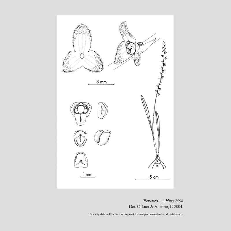 References W3 Tropicos, Kew Monocot list , IPNI; *Icones Pleurothallidinarum Vol XXVI Luer 2004 drawing fide; Native Ecuadorian Orchids Vol 5 Dodson 2004 drawing/photo fide