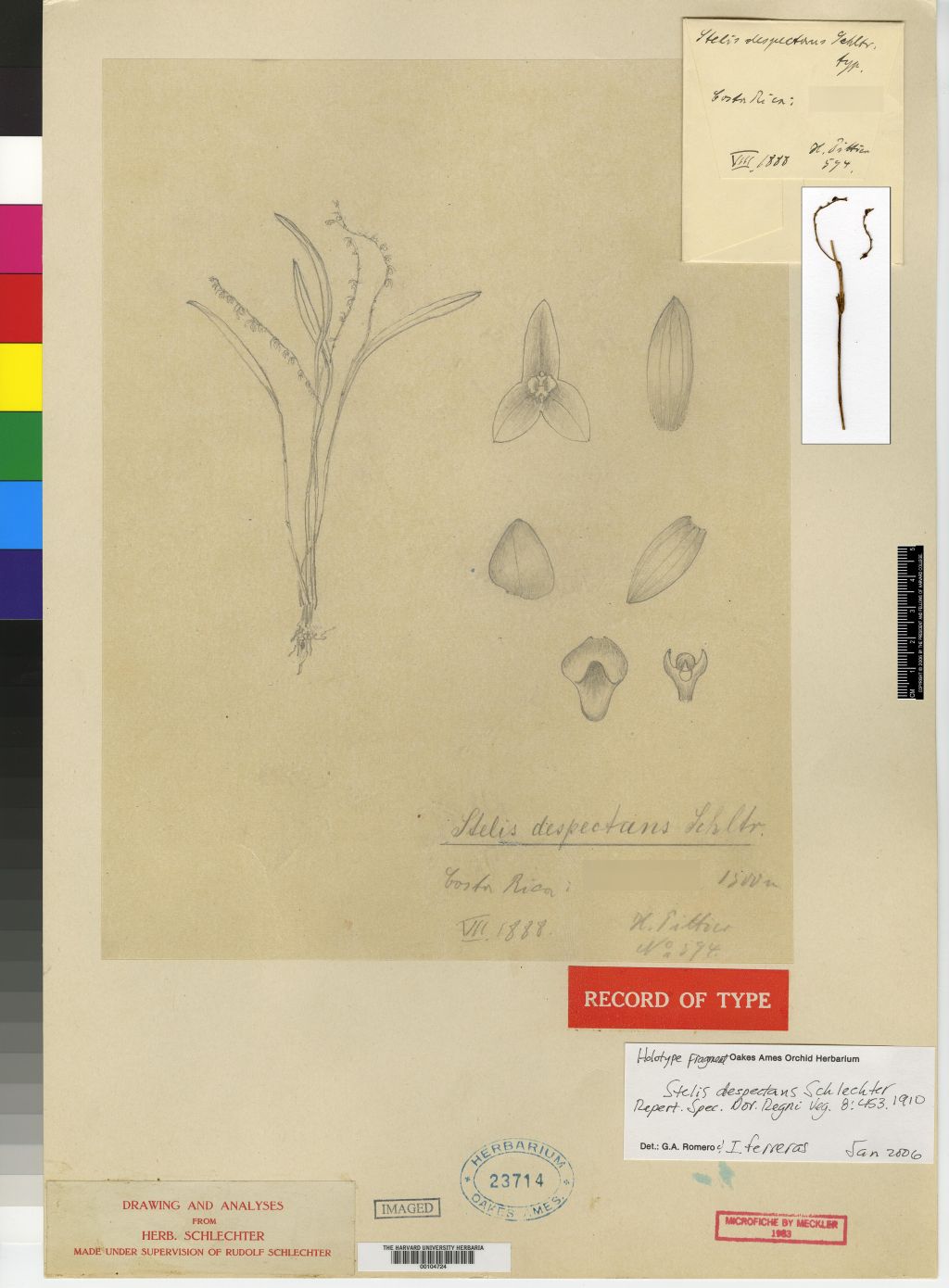 References W3 Tropicos, Kew Monocot list , IPNI ; *Repert. Spec. Nov. Regni Veg. 8: 453 Schlechter 1910; Orchids of Guatemala Ames Correll 1952 drawing good; Las Orquideas de El Salvador Vol 3 Hamer 1981 drawing/photo good; Manual de Plantas de Costa Rica Vol 3 Hammel, Grayum, Herrera and Zamora 2003; Orchidaceae Stelis Swartz A Compendium Duque 2008 drawing ok Orchid Genera and Species in Guatemala Archila, Szlachchetko, Chiron, Lipinska, Mystkowska and Bertolini 2018