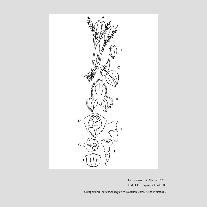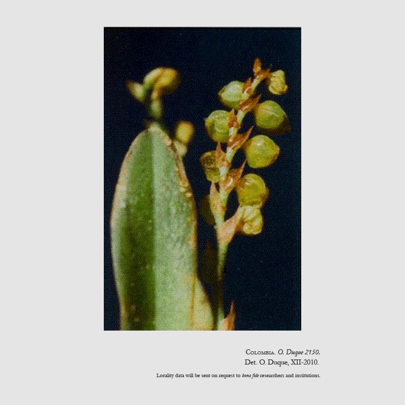 Found in Huila Colombia at elevations around 1300 meters as a mini-miniature to just small sized, warm to cool growing epiphyte with erect, slender ramicauls enveloped by 2 to 3, tubular sheaths and carrying a single, apical, erect, coriaceous, pale purple beneath, elliptical-oblong, obtuse, tridenticulate, narrowing below into the short petiolate base leaf that blooms in the late summer and early fall on 1 to 3, erect, slightly flexuous, distichous, 2 to 3.2" [5 to 8 cm] long including the peduncle, mostly simultaenously few flowered inflorescence arising from an annulus below the apex of the ramicaul with acute floral bracts.