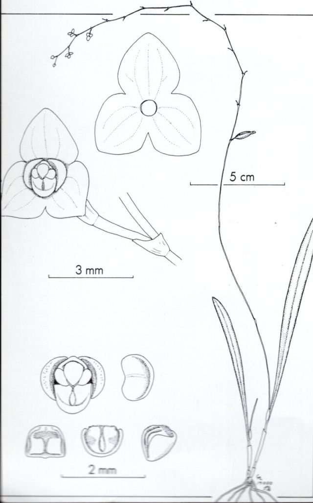 "The species is characterized by the exceedingly long inflorescence with distantly spaced flowers. The leaves are narrowly linear-elliptic, twice to thrice longer than the ramicauls. The sepals are broadly ovate and similar, the petals are single veined and the lip is semi-orbicular with a glenion and is pubescent at the base." Luer 2002