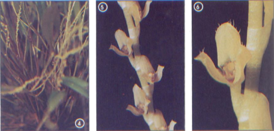 Found in Antioquia department of Colombia at elevations around 2300 meters as a small sized, cold growing epiphyte with erect, slender ramicauls enveloped by a long tubular sheath in the middle third and 2 others at the base and carrying a single, apical, erect, coriaceous, narrowly elliptical, acute, tridenticulate, contracted below into the sulcate, petiolate base leaf that blooms in the late winter and early spring on 1 to several, erect to arching, distichous, 5.2 to 8" [13 to 20 cm] long including the peduncle, mostly simultaneously many flowered inflorescence arising through an apiculate spathe with infundibular, apiculate floral bracts and carrying foul smelling flowers.
