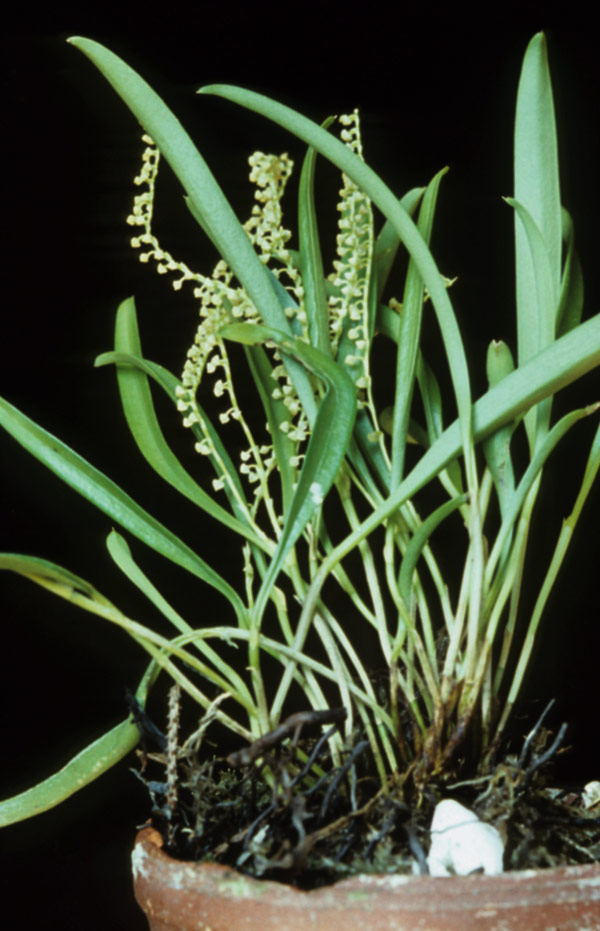 Found in Mexico, Belize, Guatemala, Honduras, Nicaragua, Costa Rica and Panama in dense, wet tropical forests at elevations around 1050 to 1100 meters as a mini-miniature sized, warm growing epiphyte with erect to ascending, slender ramicauls enveloped basally by 2 to 3, scarious sheaths and carrying a single apical, erect, subcoriaceous, oblanceolate, conduplicate below into the petiolate base leaf that blooms in the spring and summer on a filiform, slender, 4.8" [12 cm] long, densely many flowered inflorescence