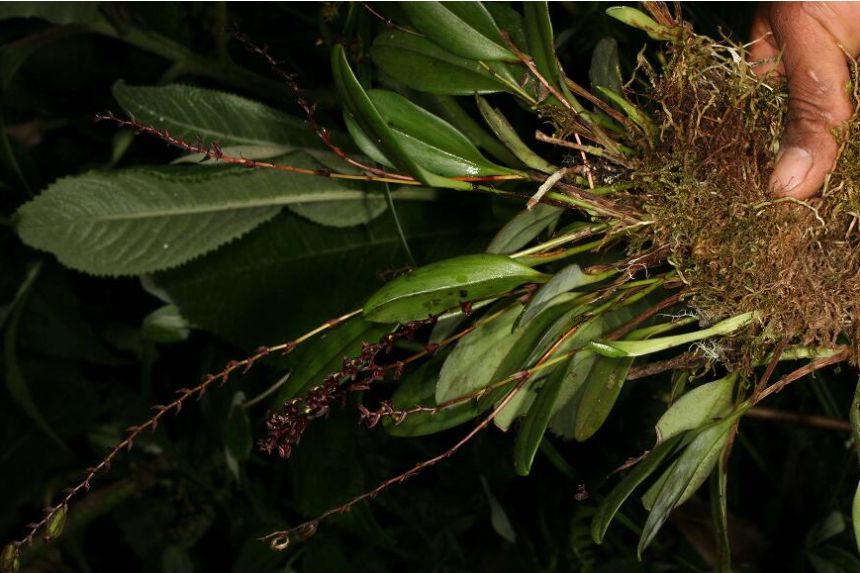 Found in Ecuador and Peru at elevations around 2300 to 2400 meters as a small sized, cold growing epiphyte with erect, slender ramicauls enveloped by 3 tubular sheaths and carrying a single, apical, erect, coriaceous, elliptical to oblong elliptic, obtuse to rounded, broadly cuneate below into the petiolate base leaf that blooms in the summer and fall on an erect, subdensely, secund, 5.4" [13.5 cm] long including the peduncle, mostly simultaneously many flowered inflorescence with conspicuous, spreading, rotundate-ovate floral bracts with an auriculate clasping base.