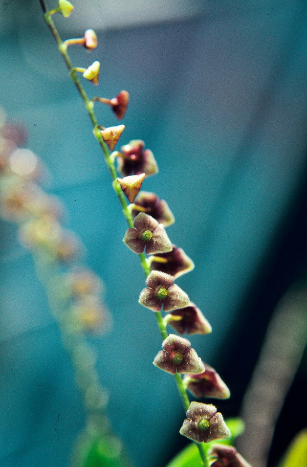Found in Guyana and Brazil at elevations of 900 to 1000 meters as a mini-miniature sized, warm to cool growing epiphyte with erect ramicauls enveloped by 3, light ocher sheaths and carrying a single, apical, erect, coriaceous, narrowly obovate, leathery, faintly conduolicate, slightly infolded towards the base leaf that blooms in the spring on a slightly bent, .6 to .8" [1.5 to 2 cm] long, 25 to 30 flowered inflorescence arising through a spathe.