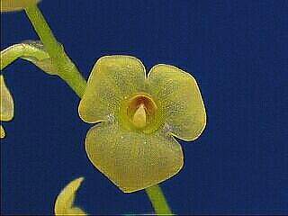 Found in Colombia, Ecuador and Peru in montane forests on trees or moss covered rocks at elevations of 1200 to 3000 meters as a small sized, cool growing epiphyte or lithophyte with an erect ramicaul enveloped basally by 2 close, tubular sheaths an carrying a single, apical, erect, coriaceous, linear oblong to elliptic oblong to linear-oblanceolate, obtuse to subacute, narrwoing below into the elongate petiolate base leaf that blooms on a solitary rarely 2, to 4.4" [11 cm] long, fractiflex, loosely many flowered inflorescence with infundibular-cucullate floral bracts