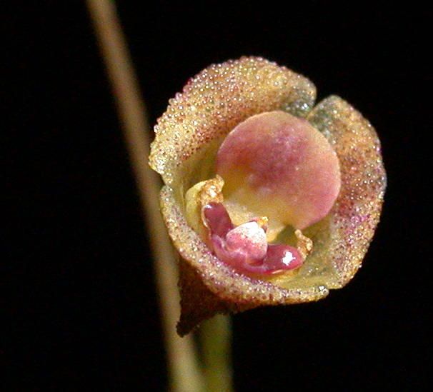 Found in northwestern Ecuador at elevations of 1400 to 3200 meters in forests as a miniature sized, cool to cold growing epiphyte with ascending, erect, slender ramicauls enveloped basally by 3 to 4, imbricating tubular sheaths and carries a single, apical, coriaceous, erect, narrowly elliptical-obovate, subacute to obtuse leaf that gradually narrows into a long petioleate base. This species blooms on an erect, 2 2/5" to 4 2/5" [6 to 11 cm] long, distantly 4 to 5 flowered, racemose inflorescence arising from an annulus below the apex of the ramicaul and having an oblique, acute, acuminate floral bracts.