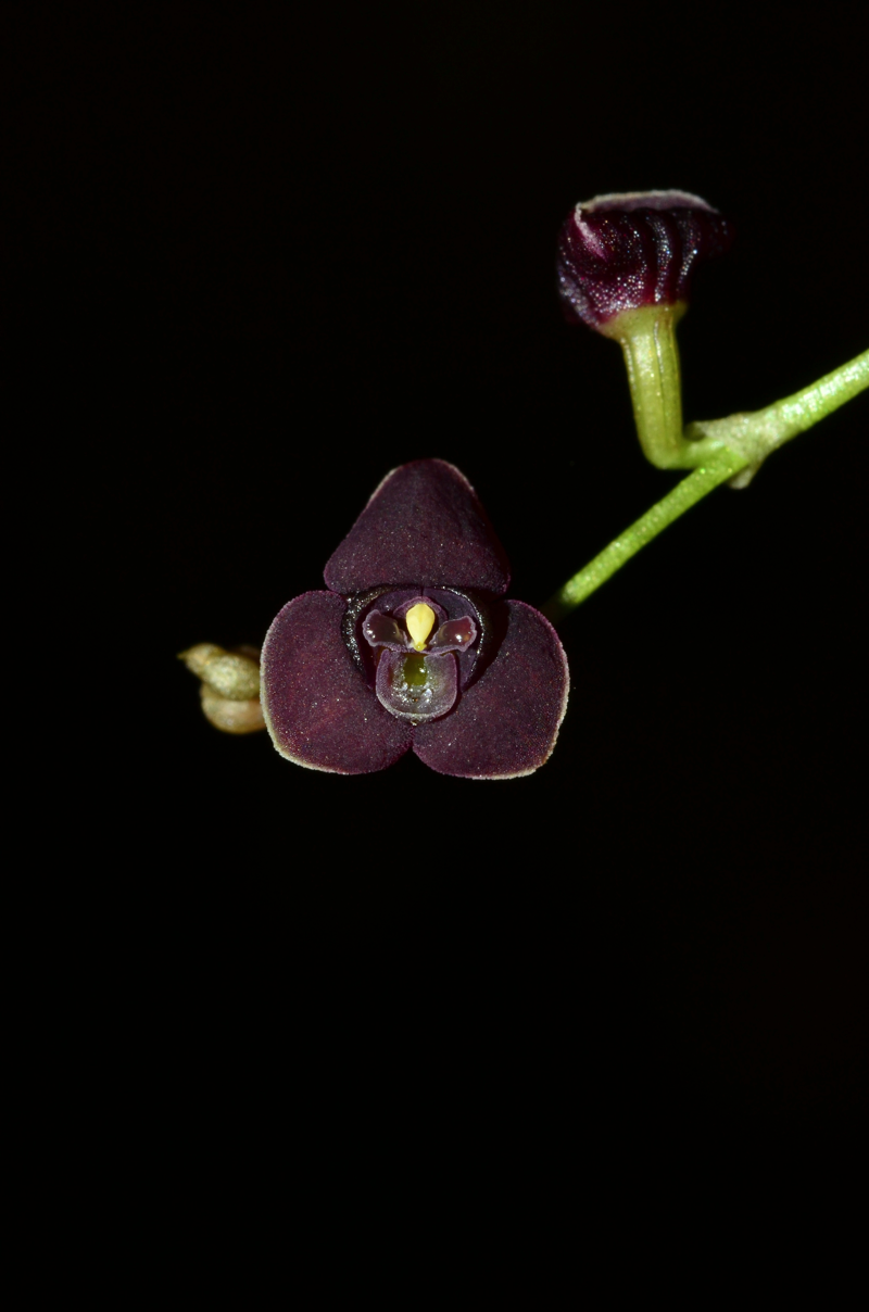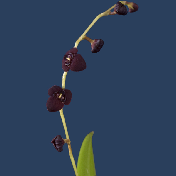 Found in Morona-Santiago Ecuador on the eastern slopes of the Andes at elevations around 800 meters as a mini-miniature sized, warm growing epiphyte with erect, slender ramicauls enveloped by a tubular sheath below the middle and 2 to 3 others at the base and carrying a single, apical, erect, coriaceous, elliptical, subacute, cuneate below into the petiolate base leaf that blooms on an erect, loose, distichous, slightly flexuous, 2 to 2.8" [5 to 7 cm] long, several flowered inflorescence arising through a spathe with an annulus below the apex of the ramicaul and has , oblique, acute, tubular floral bracts and carries several flowers that open simultaneously .