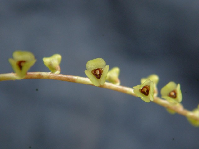 found in Mexico, Guatemala, Belize, El Salvador, Honduras, Nicaragua, Costa Rica and Panama in wet montane forests at elevations of sealevel to 1700 meters as a miniature sized, hot to warm growing eppiphyte with glabrous ramicauls enveloped basally by tubular, scarious sheaths and carrying a single, apical, coriaceous, narrowly oblanceolate to linear, cuneate below into the petiolate base leaf that is apically, bi or tri-dentate and blooms in the late spring through earlier fall on an axillary, racemose, 4 1/2" [11 cm] long, many flowered inflorescence arising through a small annulus with the flowers opening at night and closing through the day.