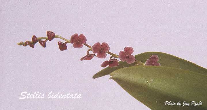References W3 Tropicos, Kew Monocot list , Orchids of Guatemala Ames Correll 1952 as S bidentata drawing fide; Orchids of Guatemala Ames Correll 1952; Encyclopedia of Cultivated Orchids Hawkes 1965 as S bidentata; Las Orquideas De El Salvador Vol 2 Hamer 1974 as S bidentata drawing/photo fide; AOS Bulletin Vol 48 No 5 1979 as S bidentata; Orquídea (Mexico City), n.s., 7[3]: 1979; Las Orquideas de El Salvador Vol 3 Hamer 1981 as S bidentata drawing ok; Icones Planetarum Tropicarum Plate 1274 Dodson 1985 as S bidentata drawing fide; Icones Planetarum Tropicarum Plate 1285 Dodson 1985 drawing good; ORQUIDEA (MEX.) 13(1- 2). DICIEMBRE 1993 as S bidentata drawing/photo ok; Icones Orchidacearum Peruviarum Plate 581 Bennett & Christenson 1998 drawing good; Manual de Plantas de Costa Rica Vol 3 Hammel, Grayum, Herrera and Zamora 2003; Orchidaceae Stelis Swartz, Compendium Duque 2008 good; Orchidees du Bresil As Orquideas da Serra do Castelo [Espirito Santo Brazil] Chiron & Bolsanello Vol 2 2013 photo ok; Diversity of Pleurothallidinae in Guatemala: An Endangered Orchid Subtribe with High Economic and Horticultural Potentials Edgar Mo Mo, Cetzal, Basu and Vega 2017 photo fide; Orchid Genera and Species in Guatemala Archila, Szlachchetko, Chiron, Lipinska, Mystkowska and Bertolini 2018 as S bidentata; Orchid Genera and Species in Guatemala Archila, Szlachchetko, Chiron, Lipinska, Mystkowska and Bertolini 2018; Lankesteriana 19(1). 31 - 55 2019 photo fide