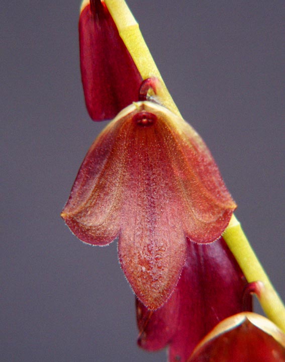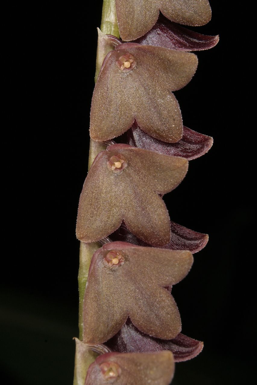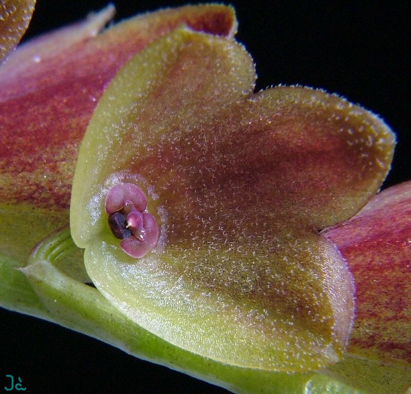 Found in Ecuador and Peru at elevations of 700 to 2400 meters as a small sized, warm to cold growing epiphyte with erect ramicauls partially enveloped by 2 to 3 tubular sheaths and carrying a single, apical, erect, coriaceous, oblong-ligulate, subobtuse, attenuate below intothe petiollate base leaf that blooms on an erct, occasionally arcuate, 3.2 to 5.6" [8 to 14 cm] long, secund inflorescence with flowers from just above the base to the apex.