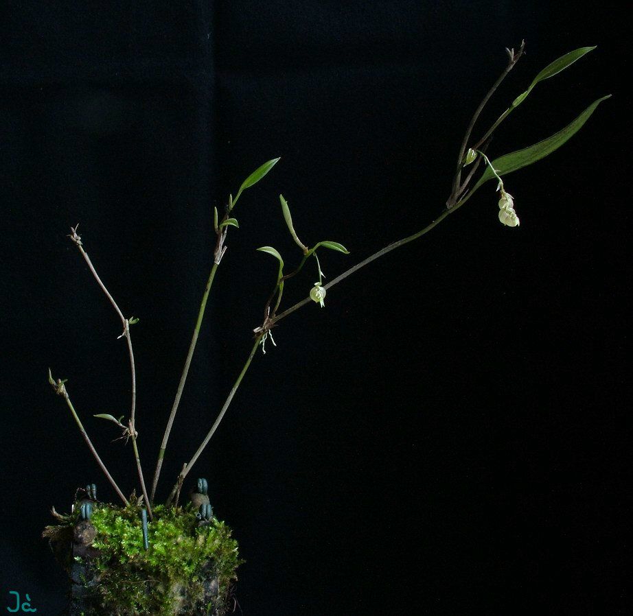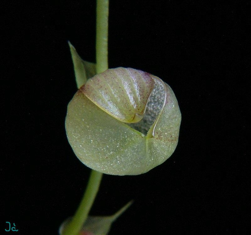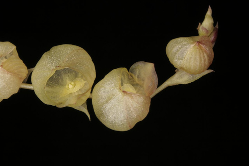 Found in western Ecuador in cloud forests at elevations of 1700 to 2000 meters as a miniature, warm to cool growing, scandent epiphyte with ascending, prolific, rooting at the internodes, to over 1 meter long ramicauls giving rise at intervasl to a single, apical, suberect, coriaceous, narrowly elliptical, acute, tridenticulate, narrowly cuneate below into the petiolate base leaf that blooms in the summer on a pendant, flexuous, to 6" [to 15 cm] long, successively 2 to 3, many flowered inflorescencewith inflated, oblique, acute floral bracts and carrying non-resupinate, globose flowers..