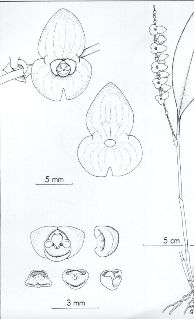 "The species is distinguished by the few racemes of relatively large flowers are about as long as the elliptrical, petiolate base leaf. The synsepal is deeply connate into a broad, non-concave, bifid synsepal,The petals are thick and broad. The lip is concave above the rounded apex." Luer 2002
