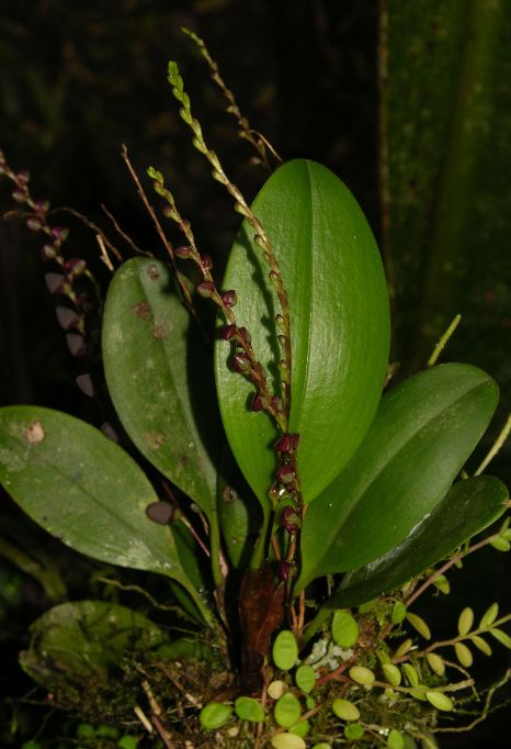 Found in Costa Rica, Panama and Colombia in low hot forests at elevations of 150 to 400 meters as a small sized, hot growing epiphtye or lithophyte with an erect, stout ramicaul enveloped by 3 inflated sheaths and carrying a single, apical, erect, elliptic-oblong, coriaceous, obtuse and tridenticulate apically, tapering below into the sulcate petiolate base leaf that blooms on a solitary, erect, 7.2" [to 18 cm] long, racemose, subdistichous, laxly many flowered inflorescence arising through 1 to 2 ancipitous spathes and has infundibular floral bracts.