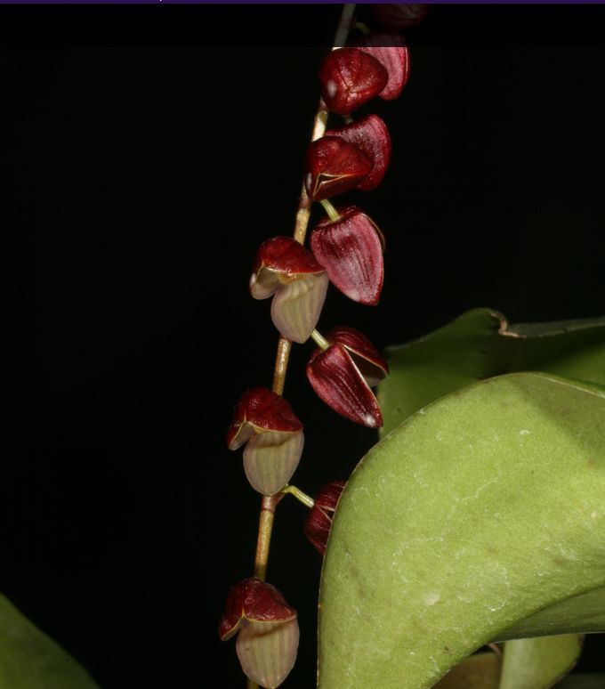 Found in Zamora Chinchipe Ecuador at elevations around 1800 meters as a mini-miniature sized, cool growing epiphtye with an erect, stout ramicaul enveloped by a tubular sheath below the middle and another at the base and carrying a single, apical, erect, coriaceous, elliptical, subacute, abruptly contracted below into the petiolate base leaf that blooms in the early winter on a solitary, erect, congested, distichous, 4.8 to 6.4" [12 to 16 cm] long including the .8 to 1.2" [2 to 3 cm] long peduncle, simultaneously several, many flowered inflorescence arising from a node below the apex of the ramicaul and has tubular floral bracts.