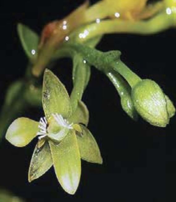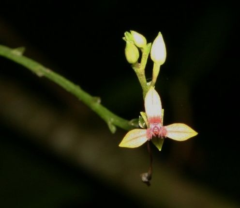 Found in Venezuela and western Ecuador and Peru in montane cloud forests at elevations of 1000 to 2500 meters as a miniature sized, cool to cold growing, caespitose twig epiphyte without pseudobulbs and with a fan of linear-lanceolate, acuminate, subcoriaceous, channeled midvein leaves that blooms at most any time of the year on an axillary, wiry, elongating to 8" [20 cm] long, racemose, successively 2 to 4, several flowered inflorescence with ovate acute floral bracts that are 1/3rd the length of the ovaries.