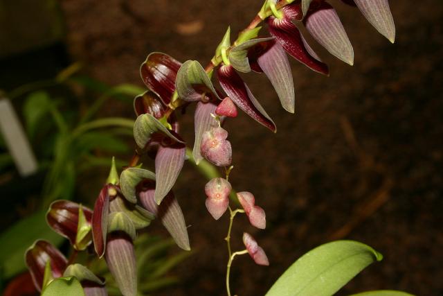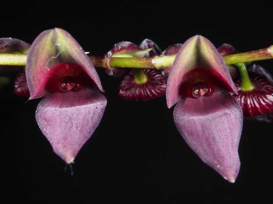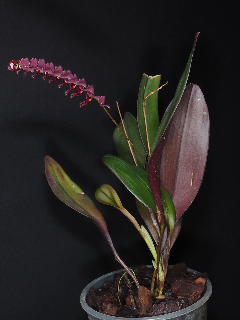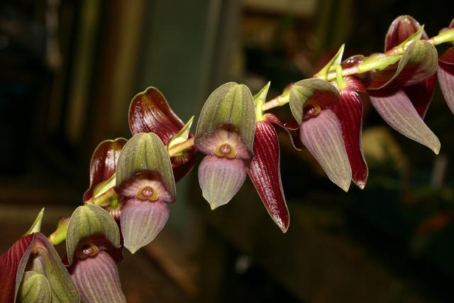 Found in Venezuela, Colombia, Ecuador and Peru in dwarf forests at elevations around 1700 to 3200 meters as a medium sized, cold growing epiphyte with erect, close set ramicauls enveloped by basal sheaths and another inflated one in the upper third and carrying a single, apical, erect, coriaceous, elliptic-oblong to broadly oblong, striated, obtuse to subobtuse, tridenticulate, narrowing abruptly into the petiolate base leaf that blooms on an erect, 6 to 10" [15 to 25 cm] long, distichous, racemose, laxly many flowered inflorescence arising through a small spathe and with cucullate, apiculate to infundibular-navicular floral bracts and carrying non-resupinate flowers.