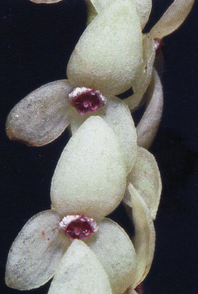 Found in Colombia, Ecuador and Peru in montane cloud forests at elevations around 2000 to 3200 meters as a climbing, small to medium sized, cool to cold, growing epiphtye with superposed, ramose ramicauls enveloped by 2 to 4 tubular sheaths and carrying a single, oblong, obtuse, coriaceous, gradually narrowing below into the petiolate base leaf that blooms on a solitary, 4 to 6" [10 to 15 cm] long, subsecund, racemose, more or less fractiflex, laxly several flowered inflroescence arising through a small spathe concealed by the uppermost sheath and has large, cucullate, acuminate floral bracts and glabrous flowers