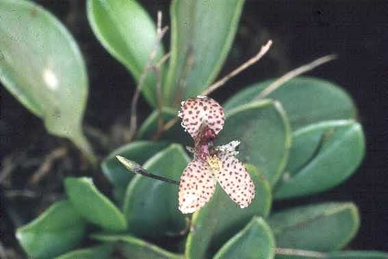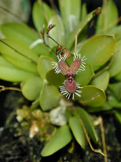 Found in Mexico, Guatemala and El Salvador as a mini-miniature sized, cool to cold growing epiphyte at elevations of 1500 to 2500 meters with erect ramicauls enveloped by 2 basal sheaths and carrying a single apical, erect, coriaceous leaf that blooms on a apical, single successive flowered, 2" [4 to 5 cm] long, fractiflex inflorescence that holds the successive opening, single flowers amid or just above the leaves occuring in the winter through mid summer. Cool temperatures, shade, and high humidity as well as mounting on tree fern, and good air movement assure a happy plant.
