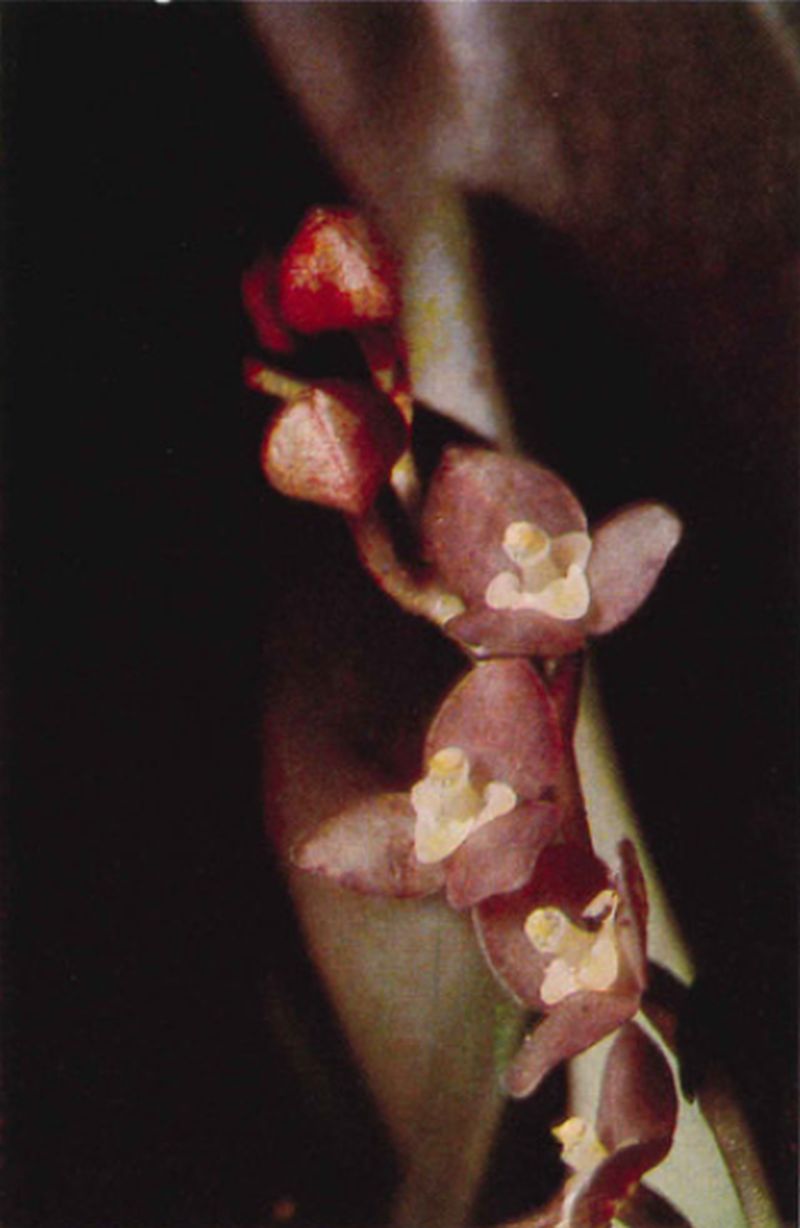 Found in Mexico, Guatemala, El Salvador, Honduras and Nicaragua in humid montane forests at elevations around 1500 meters as a mini-miniature sized, cool growing epiphyte with erect, slender ramicauls carrying a single, apical, erect, coriaceous, ovate to suborbicular, obtuse to ropunded, tridenticulate apically, cuneate to abruptly cuneate below into the petiolate base leaf that blooms at most any time of the year on an erect, filiform, to 1" [to 2.5 cm] long including the peduncle, successively few flowered inflorescence with acuminate, purple floral bracts.