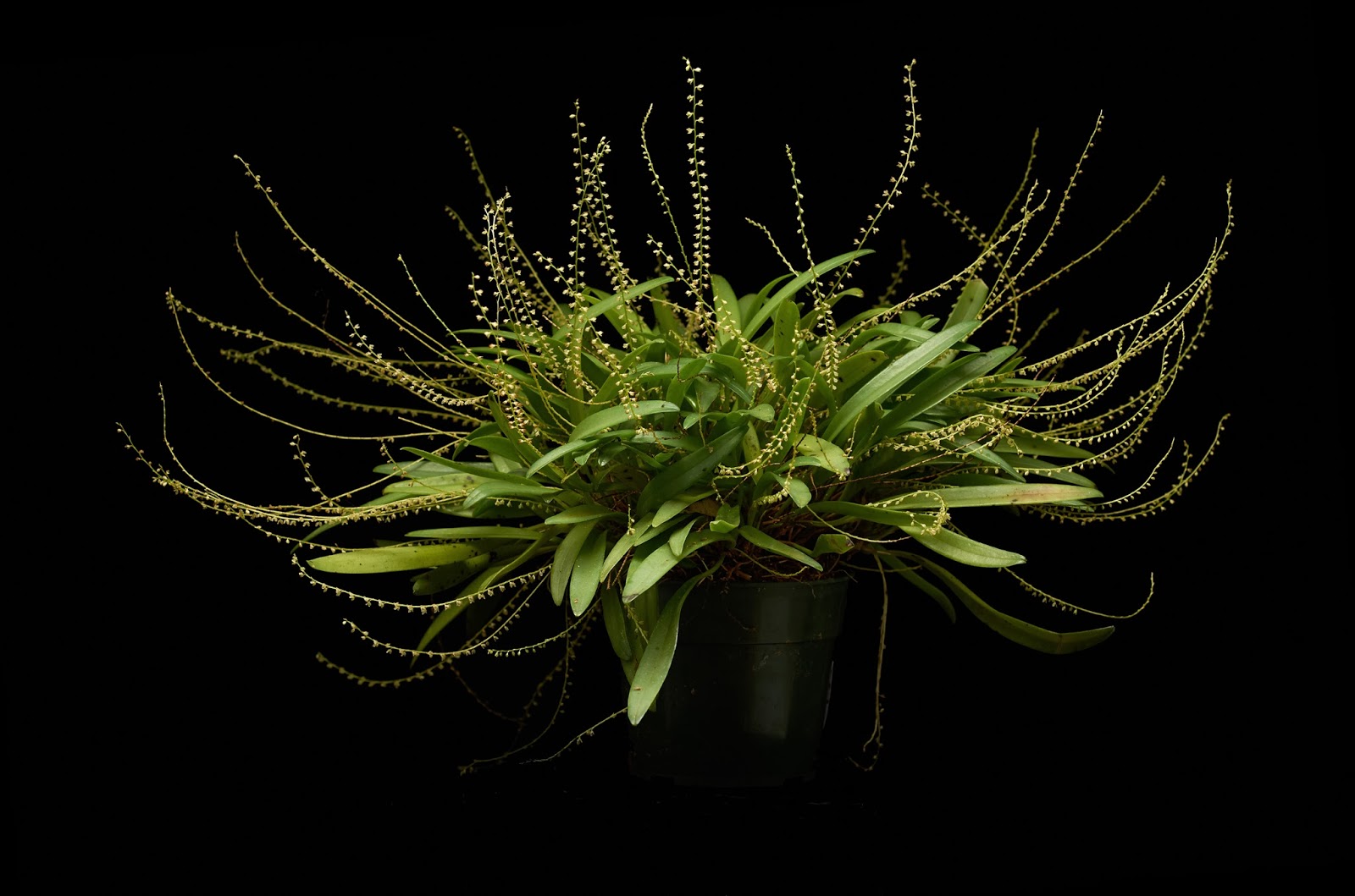 Found in Chiapas state of Mexico, Belize, Guatemala and Honduras at lower elevations as a miniature to small sized, hot to warm growing epiphyte with erect ramicauls enveloped by 3 tubular sheaths and carrying a single, apical, erect, linear-oblanceolate to linear-elliptic, coriaceous, subobtuse to acute, tridenticulate, attenuate basally into the petiolate base leaf that blooms in the late spring summer and fall on an erect to arched, disitichous, 4 to 8" [10 to 20 cm] long including the .8 to 1.2" [2 to 3 cm] long peduncle, mostly simultaneously many flowered inflorescence arising through an apiculate spathe with cucullate, shortly apiculate floral bracts.